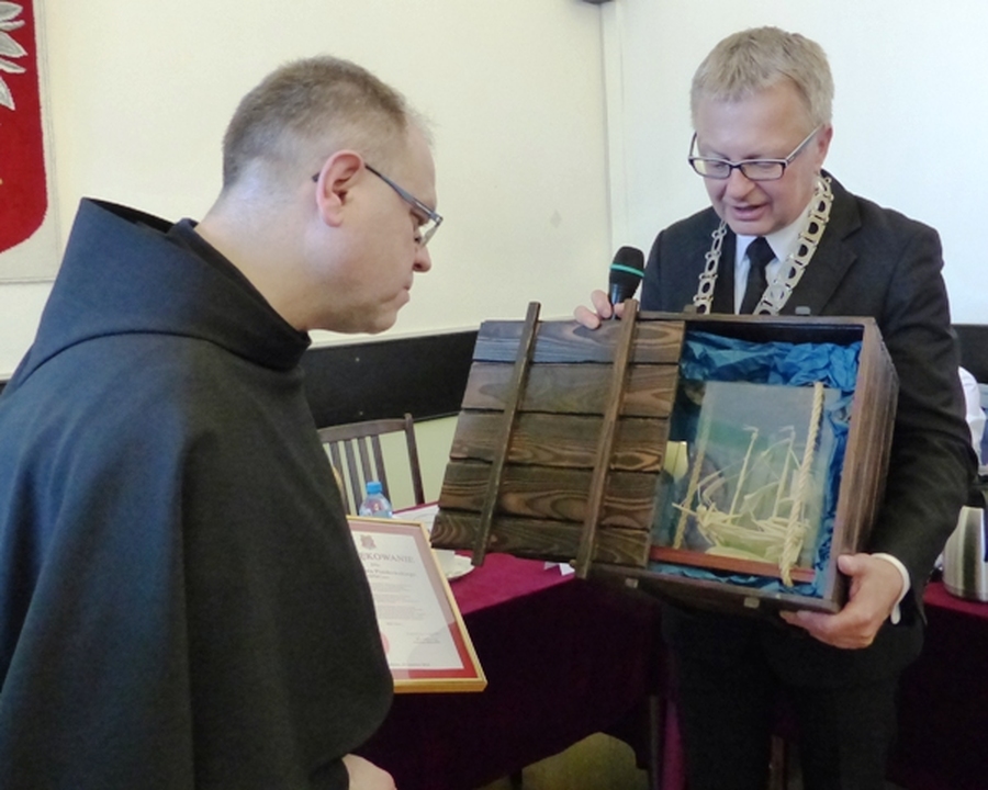 Dwanaście lat kadencji Księdza Proboszcza Stanisława Piankowskiego i Gwardiana Klasztoru Franciszkanów w Darłowie minęło bardzo szybko. Niestety, nadszedł ten czas pożegnania się z ustępującym Proboszczem i złożenia najserdeczniejszego DZIĘKUJĘ za trud i wysiłek pracy, jaki Ojciec Stanisław włożył w naszą parafię i miasto Darłowo. Z tej okazji burmistrz miasta Darłowa Arkadiusz Klimowicz na sesji Rady Miejskiej w imieniu własnym i samorządu powiedział kilka zdań na pożegnanie. Dziękujemy Bogu, że losy wybitnego kapłana zbiegły się z losami Darłowa. Rozstajemy się, lecz nie żegnamy i mamy nadzieję, na dalsze serdeczne spotkania. Trudno jest opisać zasługi, jakie położyłeś dla parafii i miasta Darłowa. Spróbuję jednak wymienić kilka istotnych działań. Pamiętamy o uratowaniu misternie rzeźbionej zabytkowej ambony z 1684 r. i ołtarza przed szkodnikami poprzez gazowanie Kościoła Mariackiego. Cieszymy się z renowacji niezwykle cennego obiektu darłowskiego bazylikowego kościoła, jakim jest późnobarokowy prospekt organowy, najwyższej klasy obiekt zabytkowy na Pomorzu. Dumni jesteśmy z naprawy i konserwacji organów darłowskiej fary, które w opinii fachowców ustępują jedynie organom z Kamienia Pomorskiego. Gratulujemy proboszczowi pozyskania blisko 1,3 mln zł unijnego wsparcia na remont ścian, dachu i wnętrza wieży naszej świątyni oraz przeprowadzenia tego remontu. Nasze myśli przywoływać będą obrazy z uroczystości kościelnych, pielgrzymek, dni seniora, kombatanta, dni białej laski, opłatków z niepełnosprawnymi i Amazonkami, procesji pokutnej i procesji czterech króli, świąt narodowych, rocznicy 3-Maja, rocznic Odzyskania Niepodległości, Dnia Osadnika i wiele innych. Były to wydarzenia, które nas jeszcze bardziej łączyły i uczyły. Dziękujemy Ci wszyscy za wszystko, co dla nas zrobiłeś, za to, że będąc sobą, dawałeś nam świadectwo prawdziwej wiary i pobożności. O. Stanisław Piankowski OFMConv został nowym Proboszczem Parafii Podwyższenia Krzyża Świętego i Gwardianem klasztoru w Koszalinie. Wyrażając naszą radość z wyboru życzymy Ci, drogi Ojcze Stanisławie dużo zdrowia i siły. Bądź świadomy, że zawsze będziemy Cię dobrze wspominać i zostawiamy dla Ciebie otwarte drzwi naszych serc. Szczęść Boże! Na pamiątkę doskonałej współpracy z darłowskim samorządem burmistrz wręczył specjalne podziękowanie i darłowska specjalność najwyższej klasy, jakim jest żaglowiec z rybich ości.
