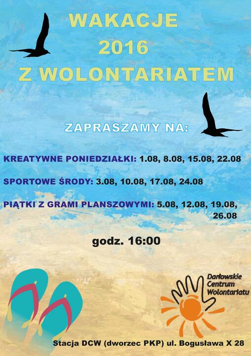 Darłowskie Centrum Wolontariatu zaprasza dzieci i młodzież do udziału w Wakacjach 2016 z Wolontariatem, w ramach których w sierpniu odbędą się następujące spotkania: