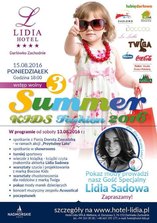 Już po raz trzeci Hotel Lidia Spa&Wellness zaprasza na niezwykły pokaz mody dziecięcej. Co nosić tego lata, która z czapek będzie hitem sezonu, jakie trendy modowe panują na salonach, placach zabaw i w szkole - tego dowiemy się już 15 sierpnia br. (tj. poniedziałek) na nadmorskim pokazie mody dziecięcej. Rozpocznie się on o godzinie 18:00. Wstęp bezpłatny. Imprezę poprowadzi gość specjalny Lidia Sadowska. Pokaz mody poprzedzony będzie trzydniowymi warsztatami z zakresu mody, spotkaniem z Dorotą Zawadzką, występem zespołu Acoustical z Darłowa. Polecamy uwadze. Szczegóły opublikowane zostały pod adresem: http://www.hotel-lidia.pl/summer_kids_fashion_2016