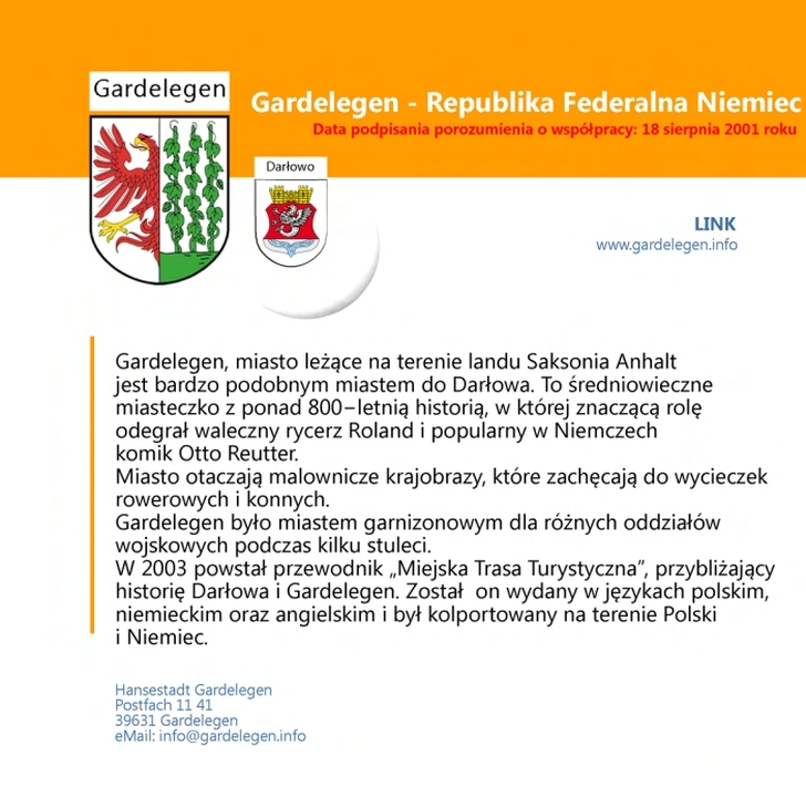 Gardelegen jest miastem leżącym na terenie landu Saksonia Anhalt jest bardzo podobnym miastem do Darłowa. To średniowieczne miasteczko z ponad 800-letnią historią, w której znaczącą rolę odegrał waleczny rycerz Roland i popularny w Niemczech komik Otto Reutter.