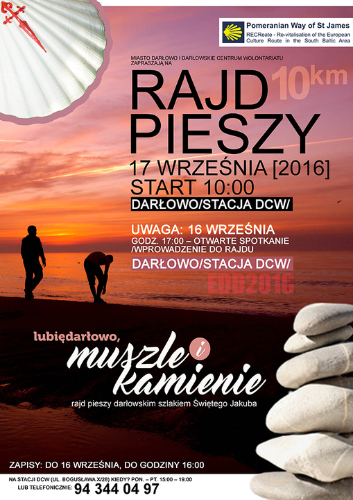 Miasto Darłowo i Darłowskie Centrum Wolontariatu zapraszają na rajd pieszy darłowskim szlakiem Świętego Jakuba pn. lubiędarłowo, muszle i kamienie. Rajd odbędzie się 17 września br. (tj. sobota). Rozpocznie się punktualnie o godzinie 10:00 z Darłowskiego Centrum Wolontariatu. Trasa liczyć będzie około 10 km, wiodła będzie przez centrum miasta, otaczając trzy kościoły znajdujące się w starej części miasta. Przy okazji odkryjemy kilka szlakowych muszli, poznamy nieznane, spędzimy czas miło i aktywnie. Na zakończenie każdy swój kamień - jeden z symboli pielgrzymkowego szlaku złoży na górze w Cisowie. Jakubowych globtroterów przyjmą gościnnie mieszkańcy Sołectwa Cisowo i strażacy z Ochotniczej Straży Pożarnej w Cisowie.