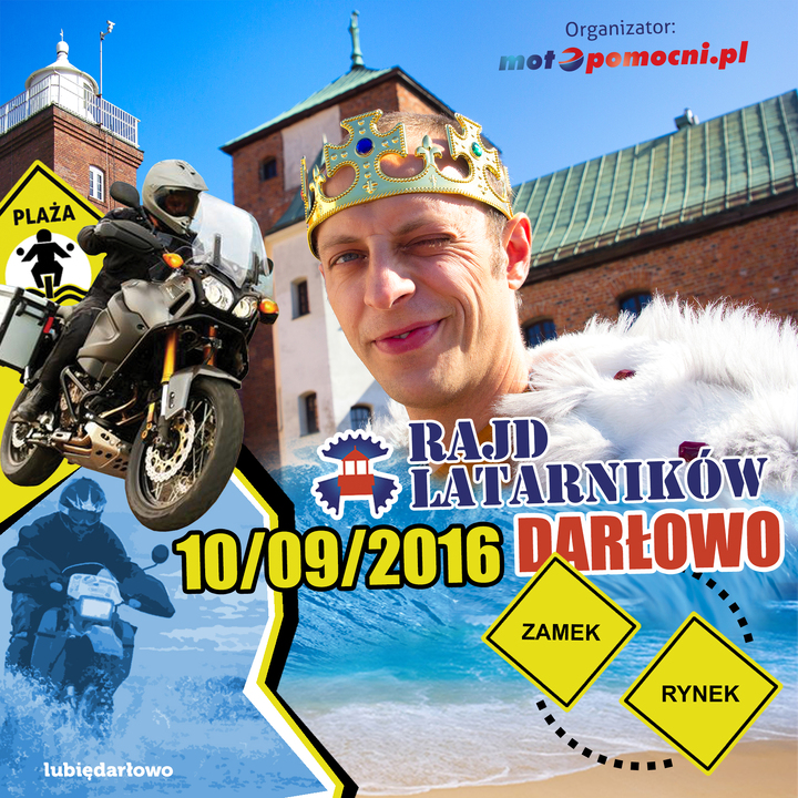Informujemy, że w dniu jutrzejszym - tj. sobota 10 września 2016, na terenie Miasta Darłowa odbędzie się motocyklowy rajd przygodowy pn. Rajd Latarników. Weźmie w nim udział około 200 zawodników. Ich przyjazd do miasta spodziewany jest od godziny 10:00. Pierwszy punkt kontrolny zlokalizowany jest przy Latarni Morskiej w Darłówku, do której zawodnicy dojadą drogami asfaltowymi kurortu, natomiast ci którzy obrali trasy adventure obiekt zdobędą dojeżdżając do niego plażą. Odcinek nadmorski wyznaczono na długości około 1,5 km na plaży wschodniej (od ul. Słowiańskiej - wjazd na plażę od terenu tzw. Patelni - do ul. Wschodniej gdzie znajduje się Latarnia Morska). Dalej - zawodnicy zmierzać będą do centrum miasta, gdzie w rynku miejskim do pokonania będą mieli tor przeszkód sprawnościowych. Po nim złożą pokłon Królowi Erykowi na dziedzińcu zamkowym. Impreza na terenie Darłowa potrwa do godziny 14:30, dalej motocykliści obiorą kierunek Malechowo gdzie w Forcie Marian czekać na nich będą kolejne przygodowe wyzwania.