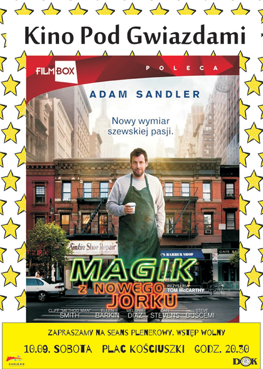 W najbliższą sobotę, 10 września o godzinie 20:30 zapraszamy na Rynek Miejski w Darłowie, gdzie w ramach Kina Pod Gwiazdami wyświetlony zostanie film pt.: Magik z Nowego Jorku". Film z 2014 roku, o znużonym pracą nowojorskim szewcu, który dostaje niecodzienną szansę, by wkroczyć w życie swoich klientów. Na bezpłatny seans zaprasza Darłowski Ośrodek Kultury.