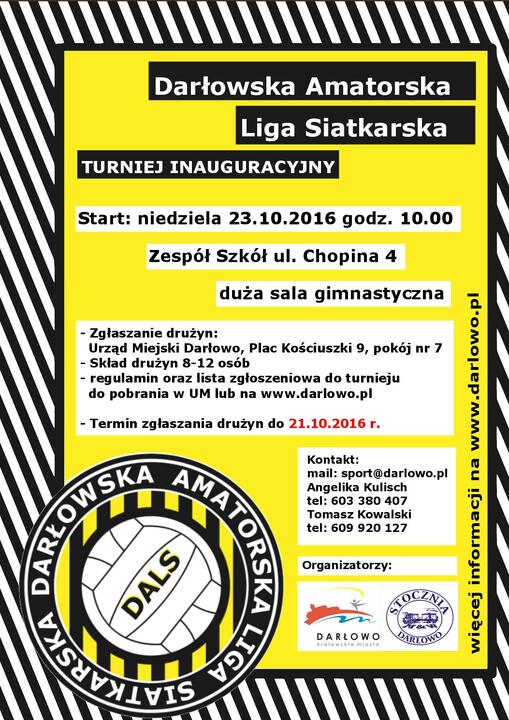 W niedzielę 23 października 2016 r. o godz. 10.00 w Zespole Szkół im. Stefana Żeromskiego na dużej sali gimnastycznej odbędzie się turniej inauguracyjny Darłowskiej Amatorskiej Ligi Siatkarskiej „DALS".
