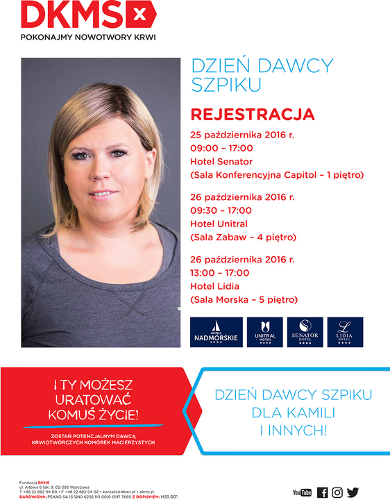 Hotele Nadmorskie, które tworzą: Hotel Senator w Dźwirzynie, Hotel Unitral w Mielnie i Hotel Lidia w Darłowie, we współpracy z Fundacją DKMS organizują w dniach 25-26 października 2016 roku Dni Dawcy Szpiku. Pomysł aby wesprzeć Fundację DKMS pojawił się gdy z chorobą musi zmierzyć się jeden z pracowników sieci hotelowej - Kamila Barszczewska, dyrektor Hotelu Senator. W dniach 25-26.10.2016 odbędzie się rejestracja potencjalnych dawców szpiku, na terenie wszystkich ww. hoteli - w tym w hotelu Lidia w Darłówku. Tu rejestracja odbędzie się 26 października br., na terenie hotelu - Sala Morska (piętro 5) w godzinach 13:00 - 17:00.