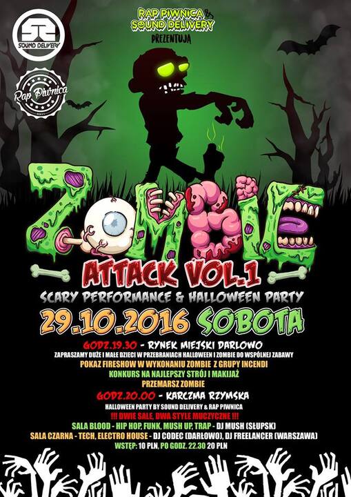 Rap Piwnica i Sound Delivery zapraszają już w najbliższą sobotę na niezwykłą hallowenową noc. Zombie Attack vol. 1 to przygotowana specjalna impreza dla młodszych i starszych. Zapraszamy "duże" i małe dzieci 29 października o godz. 19.30 na rynek miejski przed ratuszem. Tam koszalińska grupa kuglarska Incendi zaprezentuje niezwykły pokaz fireshow w specjalnym "zombiakowym" programie. Mile widziane przebrania hallowenowe. Tajne jury wyłoni najlepszy strój i makijaż. Zapraszamy również amatorów fotografii do uwiecznienia scenerii rynku rozświetlonego żywym ogniem. Następnie oficjalnie dzieci będą mogły wspólnie się bawić na terenie miasta robiąc psikusy i kolekcjonować łakocie. O godz. 20.00 zapraszamy osoby pełnoletnie na upiorną imprezę w Karczmie Rzymskiej. Dwie sale. Dwa style muzyczne. Zagości hip-hop, reggae, funk, trap, electro house i tech. Zadbają o to Dj Mush (Słupsk), Dj Codec (Darłowo) oraz Dj Freelancer (Warszawa). Wstęp na hallowenowe party: 10 PLN, po godz. 22.30 - 20 PLN. Zapraszamy !
