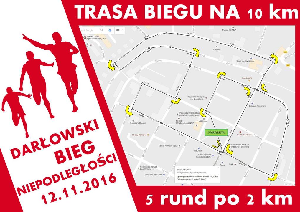 Informuję, że 12 listopada 2016 r. odbędzie się bieg na 10 km „III Darłowski Bieg Niepodległości". W związku z powyższym na czas wyścigu trasa będzie zamknięta i wyjazd autami będzie niemożliwy.