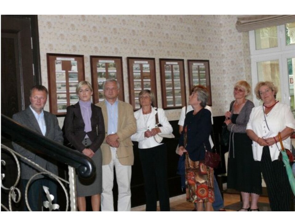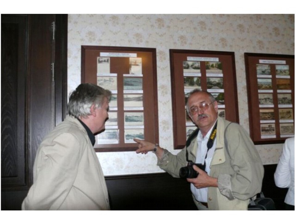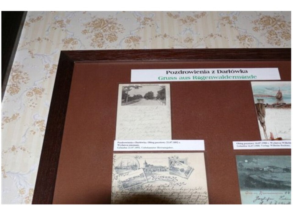 Kustosz darłowskiego muzeum Konstanty Kontowski przy ekspozycji pocztówekPodczas otwarcia wystawy pocztówekPierwsze pocztówki z kurortu Darłowo z lat dziewięćdziesiątych XIX wieku