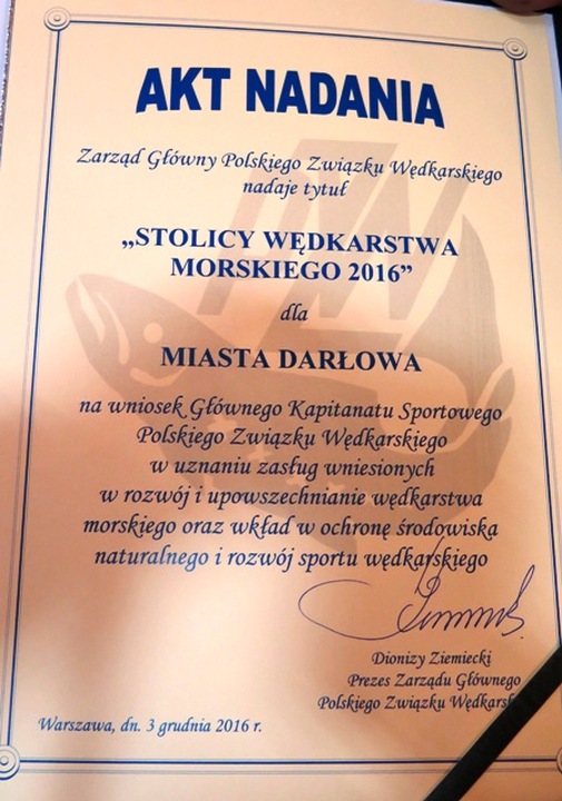 Z tej okazji organizatorzy wręczyli przybyłym okolicznościowe metalowe znaczki przypinane do klapy. Uroczystość zaszczycili: starosta sławieński Wojciech Wiśniowski, burmistrz Darłowa Arkadiusz Klimowicz, przedstawiciel zarządu Głównego PZW- Józef Wróblewski, burmistrz miasta Złocieniec, kierownik Komisariatu Policji w Darłowie Andrzej Kamoda a także liczne grono wędkarzy z Darłowa i Sławna oraz ich przyjaciół. W imieniu prezesa PZW Dionizego Ziemieckiego Akt Nadania Tytułu Stolicy Wędkarstwa Morskiego dla miasta Darłowa wręczył przedstawiciel ZG PZW. Działo się tak na wniosek Kapitanatu Sportowego PZW w uznaniu zasług dla wniesionych w rozwój i upowszechnienie wędkarstwa morskiego oraz wkład w ochronę środowiska naturalnego i rozwój sportu wędkarskiego. Burmistrz Darłowa (też wędkarz ) -Arkadiusz Klimowicz serdecznie dziękował władzom PZW za ten zaszczytny tytuł i zapewnił, że Darłowo, jak na stolicę przystało zawsze będzie przyjazne dla Wędkarzy, szczególnie morskich. Z okazji spotkania opiekun Darłowskiej Szkółki Wędkarskiej Zbigniew Surgiel został wyróżniony Srebrną Odznaką PZW. Organizatorami dorocznego spotkania byli prezes miejscowego koła PZW Piotr Ebel i prezes stowarzyszenia Miłośników rzeki Wieprzy i Grabowej Wiesław Połczyński.