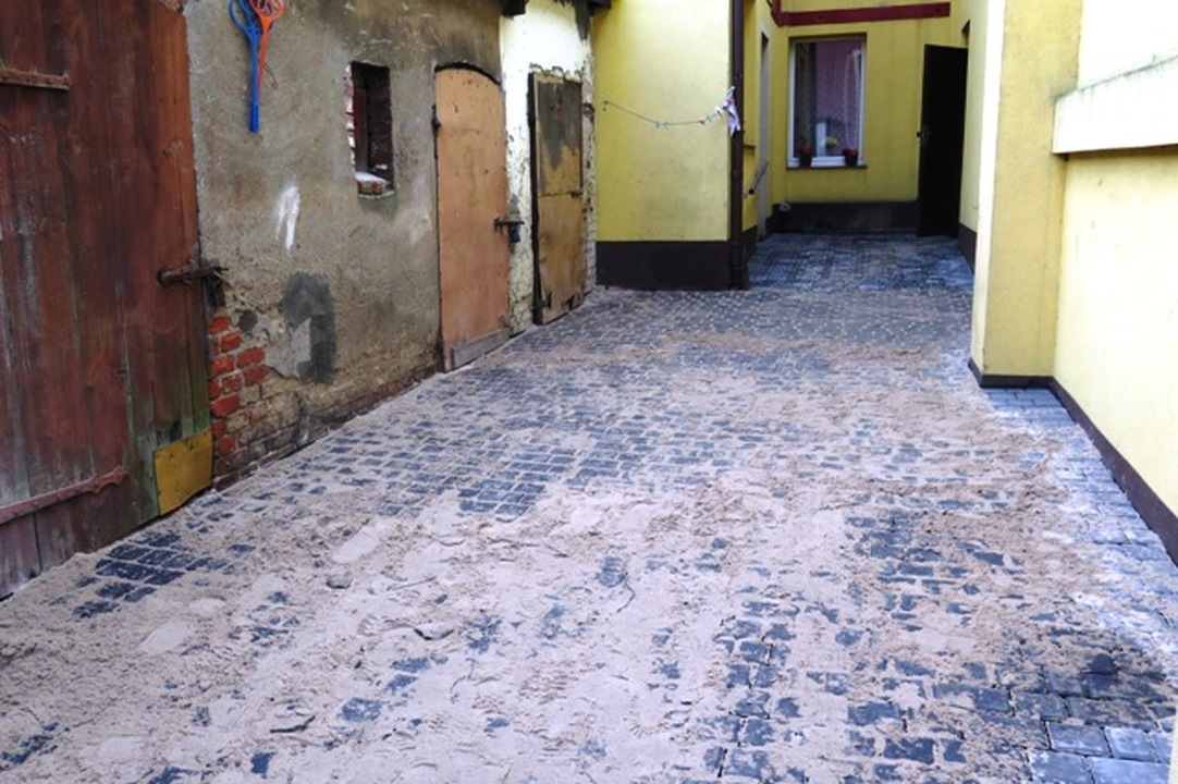 Zakończono prace kanalizacyjne i położono nową nawierzchnię z kostki betonowej na podwórku położonym na zapleczu domów w narożu ulic Wenedów i Kościelnej. Jak nas informuje Waldemar Bonk – kierownik referatu gospodarki komunalnej i mieszkaniowej w Urzędzie Miejskim dokonano wymiany kolektora sanitarnego i w miejscu gdzie było błoto położono ponad 100 metrów kwadratowych nowej nawierzchni. Całość wykonanych robót kosztowała 32 tys. złotych.