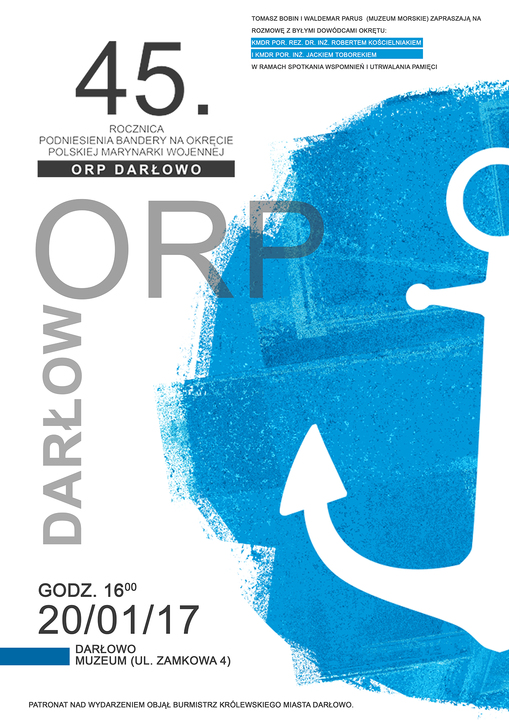 W związku z mijającą 45. rocznicą podniesienia bandery na okręcie Polskiej Marynarki Wojennej ORP Darłowo (1972-2017) zapraszamy do udziału w spotkaniu, które odbędzie się 20 stycznia br. (tj. piątek) w Zamku Książąt Pomorskich - Muzeum w Darłowie (ul. Zamkowa 4). Rozmowę z byłymi dowódcami okrętu: kmdr por. rez. dr. inż. Robertem Kościelniakiem i kmdr por. inż. Jackiem Toborekiem w ramach spotkania wspomnień i utrwalania pamięci przeprowadzą: Tomasz Bobin i Waldemar Parus (Muzeum Morskie).
