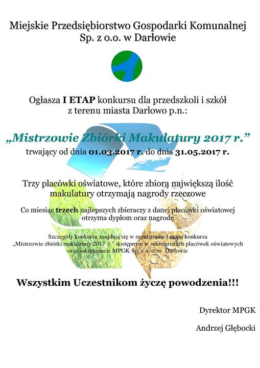 Jak nas informuje Dariusz Pawlaczyk dyrektor ds. marketingu w Miejskim Przedsiębiorstwie  Gospodarki Komunalnej w Darłowie  na stronach internetowych firmy zamieszczono podsumowanie i wyniki  ubiegłorocznego konkursu mistrzowie zbiórki makulatury. Udział wzięło w nim 5 przedszkoli, Szkoła Podstawowa Nr 3 i Miejskie Gimnazjum.  Pierwsze miejsce zdobyło Niepubliczne Przedszkole „Oto Bajka”, które zebrało 790 kg makulatury, co daje przeciętną 46,47 kg na jedno dziecko. Drugie miejsce wywalczyło Niepubliczne przedszkole Great „Sasetka”, które zebrało 1168,2 kg makulatury, tj. 33,38 kg na jedno dziecko. Trzecie miejsce zajęło Niepubliczne Przedszkole przy Szkole zbierając 2426 kg makulatury, czyli 26,66 kg na jedno dziecko. Najwięcej, bo 3020 kg  makulatury zebrało Przedszkole nr 2 im. Janiny Porazińskiej.              Jednocześnie ogłoszono nowy konkurs na zbiórkę makulatury, który będzie trwał do 31 maja 2017. Konkursy z nagrodami „Mistrzowie zbiórki makulatury”  są organizowane od 2006 roku, po dwa etapy rocznie. Jeden wiosną, a drugi jesienią. Co roku dzieci w ten sposób zbierają około 20 ton makulatury. Zbiórka jak największej ilości makulatury nie jest jedynym celem konkursów. Równie ważny jest aspekt edukacyjny, chodzi o wytworzenie w najmłodszych  nawyku segregowania odpadów i ochronę środowiska poprzez zmniejszanie ilości śmieci składowanych na wysypiskach. Szczegółowy regulamin jest zamieszczony na nasze stronie internetowej www.mpgkdarlowo.pl   Oprócz nagród zbiorowych, co miesiąc trzech najlepszych zbieraczy z poszczególnych placówek oświatowych otrzyma dyplom i nagrodę.  Przy okazji informujemy, że na terenie miasta Darłowa rozmieszczono nowe niebieskie pojemniki na zbiórkę makulatury. Prosimy więc wszystkich mieszkańców o segregowanie makulatury i wrzucanie jej do odrębnych pojemników.
