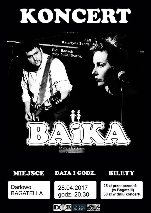Darłowski Ośrodek Kultury zaprasza 28 kwietnia br., zaprasza na koncert zespołu BAiKA. W skład grupy wchodzą: Kafi (Katarzyna Sondej) i Piotr Banach (związany z takimi zespołami jak m.in.: Hey i Indios Bravos).