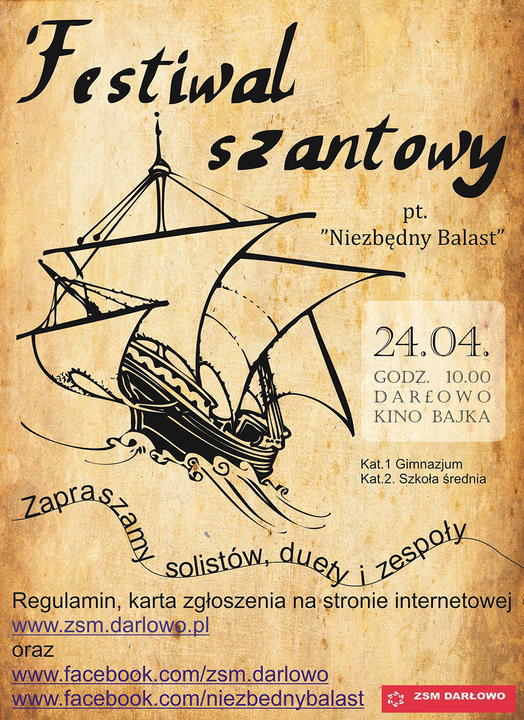 Zespół Szkół Morskich w Darłowie - najstarsza średnia szkoła, szkoląca przyszłych Ludzi Morza, kołyska zespołu Niezbędny Balast ma zaszczyt zaprosić na I Festiwal Szantowy. Odbędzie się on oczywiście w portowym Darłowie, 24 kwietnia br. Impreza zorganizowana będzie w gościnnych progach Darłowskiego Ośrodka Kultury - w Kinie Bajka, przy ul. Morskiej 56. Szczegółowy regulamin oraz karta zgłoszenia - zostały opublikowane pod adresem: https://darlowo.pl/pl/?page=imprezy&impreza=1913
