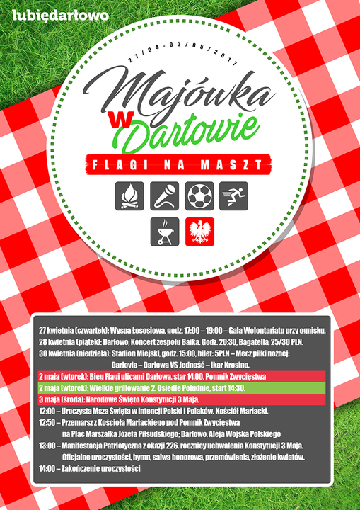 2 maja (wtorek): Bieg Flagi ulicami Darłowa. Start godz. 14:00 - Pomnik Zwycięstwa.