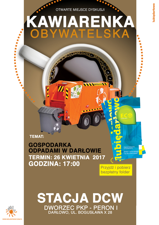 26 kwietnia br. - tj. środa na Stacji DCW (były dworzec PKP) odbędzie się kolejna kawiarenka obywatelska. Tym razem poświęcona ona będzie gospodarce odpadami komunalnymi. O tym co to są frakcje, jakie kolory worków stosujemy, kiedy i gdzie można pozbyć się starych mebli, gruzu lub zużytego sprzętu RTV i AGD dowiecie się podczas środowego spotkania, które rozpocznie się o godzinie 17:00. Poprowadzą je pracownice darłowskiego ratusza z Referatu Gospodarki Odpadami. Każdy zainteresowany otrzyma ponadto folder będący małym podręcznym wademekum wiedzy jaką powinien posiać każdy z nas - czyli producenci śmieci.