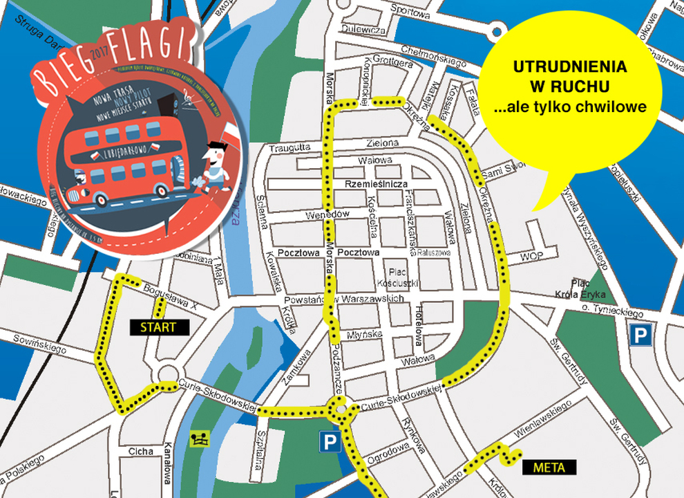 Dokładnie za tydzień, we wtorek 2 maja 2017 roku mieszkańcy Darłowa oraz przebywający podczas Majówki 2017 w mieście turyści i wszyscy chętni spotkają się na linii startu biegu biało-czerwonych czyli popularnego w Darłowie - Biegu Flagi. W związku z tym informujemy, że w godzinach 14:00 - 14:40 mogą wystąpić chwilowe utrudnienia w ruchu drogowym na ulicach, którymi przebiega trasa tegorocznej edycji Biegu Flagi Rzeczypospolitej Polskiej. A jakie to ulice? Poniżej podajemy dokładny przebieg trasy: