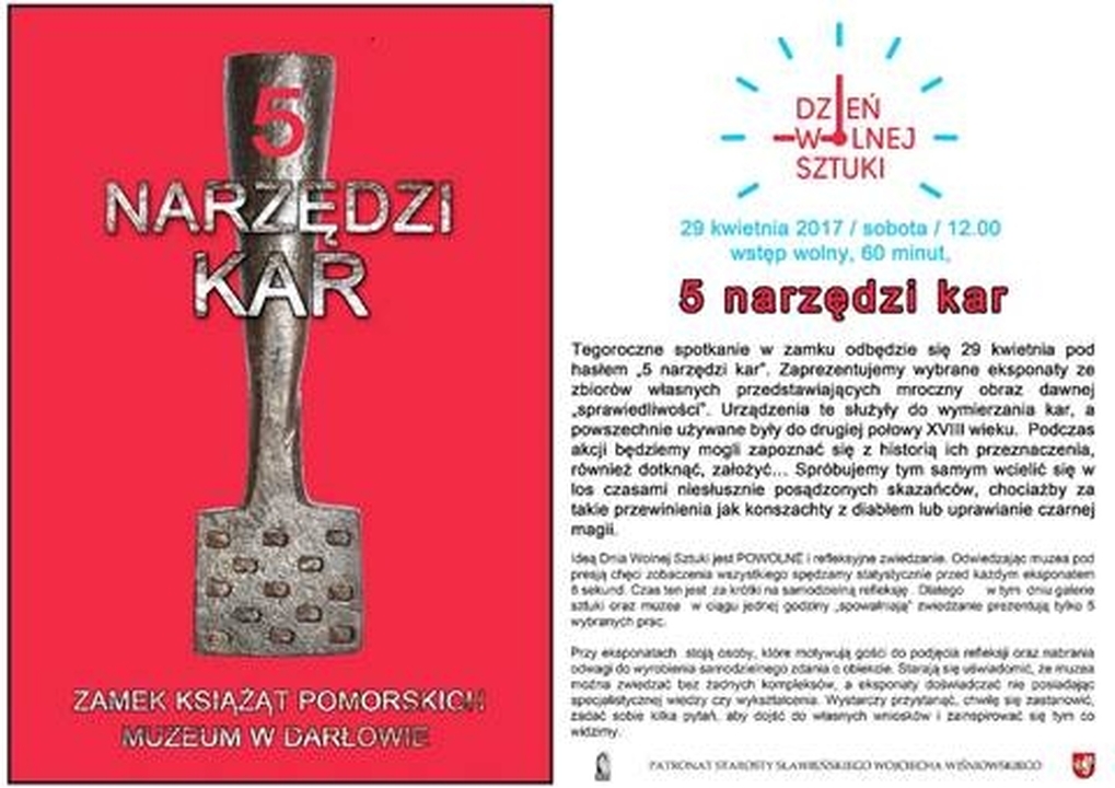 Tegoroczne spotkanie w zamku odbędzie się 29 kwietnia pod hasłem „5 narzędzi kar”. Zaprezentujemy wybrane eksponaty ze zbiorów własnych przedstawiających obraz dawnej „sprawiedliwości”. Urządzenia te służyły do wymierzania kar, a powszechnie używane były do drugiej połowy XVIII wieku. Podczas akcji będziemy mogli zapoznać się z historią ich przeznaczenia, również dotknąć, założyć… Spróbujemy tym samym wcielić się w los czasami niesłusznie posądzonych skazańców, chociażby za takie przewinienia jak konszachty z diabłem lub uprawianie czarnej magii.