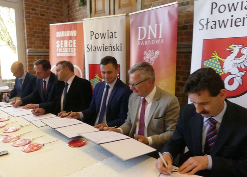 W  poniedziałek 22 maja   na Dworcu Kolejowym w Darłowie, władze Darłowa z przewodniczącą Rady Miejskiej Krystyną Sokolińską i burmistrzem Arkadiuszem Klimowiczem na czele wraz z liczną grupą przedszkolaków  wielkimi lizakami zatrzymali  nowoczesny szynobus przy odnowionym peronie. Przybyli nim: Tomasz Sobieraj –wicemarszałek Województwa Zachodniopomorskiego, Wojciech Wiśniowski –starosta Powiatu Sławieńskiego, Jan Krawczuk, wicestarosta  sławieński, Krzysztof Frankenstein – burmistrz Sławna, Radosław Głażewski – wójt Gminy Darłowo, Ryszard Stachowiak  - wójt Gminy Sławno oraz przedstawiciele Zachodniopomorskich Kolei Regionalnych.                                                             W siedzibie Darłowskiego Centrum Wolontariatu podpisano umowę  o dofinansowaniu pasażerskich przewozów kolejowych  na trasie Sławno-Darłowo- Sławno. Umowę ze strony  samorządów położonych na trasie przejazdu szynobusu podpisali: starosta powiatu sławieńskiego, burmistrzowie Darłowa i Sławna, wójtowie gmin Sławna i Darłowa.  W imieniu Województwa Zachodniopomorskiego   umowę podpisał wicemarszałek Tomasz Sobieraj. Wygodny szyno bus posiada 103 siedzące  i może zabrać 241 osób. Będzie kursował od 24 czerwca do 3 września 4 razy w dni robocze i 6 razy w dni wolne od pracy. Cena biletu 5 złotych.  Gdy zostanie ustalony rozkład jazdy powiadomimy o tym naszych Czytelników. Gospodarz Darłowa Arkadiusz Klimowicz uhonorował  podpisujących umowę medalami wydanymi z okacji 705 rocznicy II lokacji Darłowa  oraz zapowiedział, że będą czynione starania aby pasażerskie połączenie kolejowe  Darłowo - Sławno było czynne 365 dni w roku.