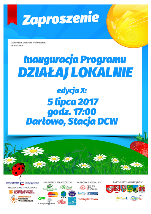 Darłowskie Centrum Wolontariatu zaprasza na uroczystą inaugurację Programu Działaj Lokalnie - edycja X, 2017 Polsko - Amerykańskiej Fundacji Wolności w powiecie sławieńskim. Gala odbędzie się 5 lipca 2017 roku (tj. środa) o godzinie 17:00 - w siedzibie Darłowskiego Centrum Wolontariatu przy ul. Bogusława X/28 w Darłowie (Stacja DCW).