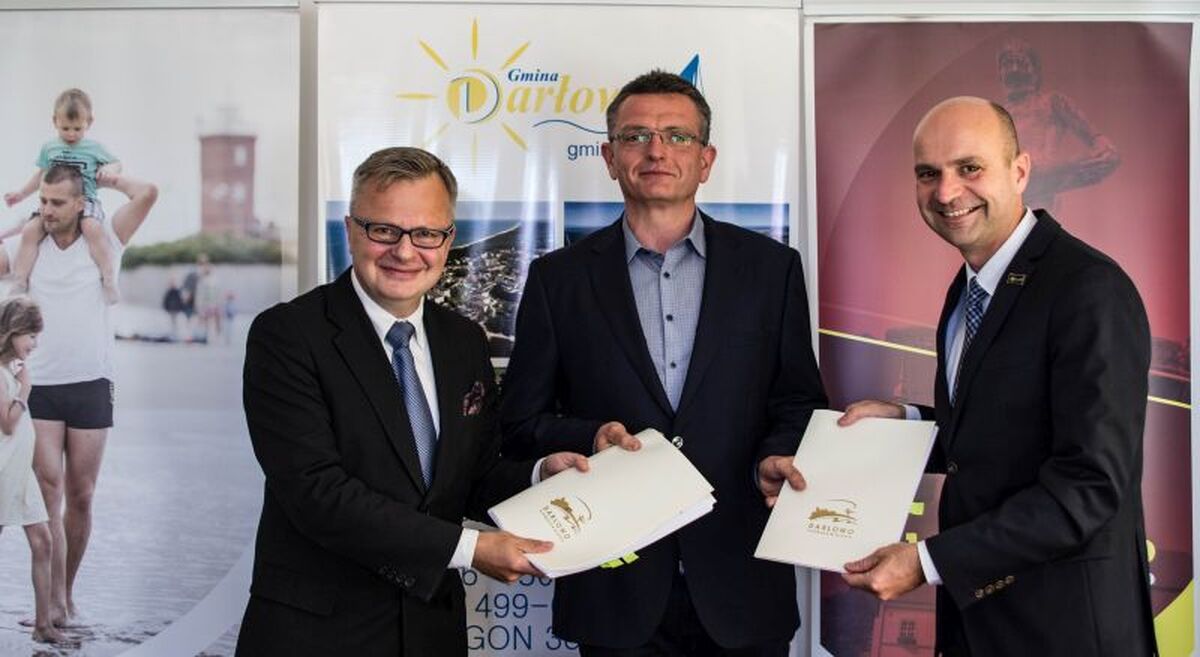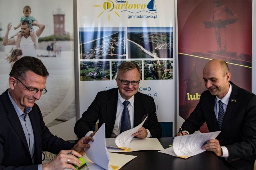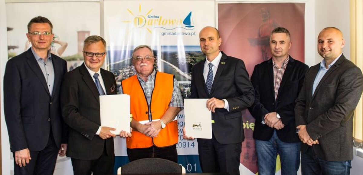 W dniu dzisiejszym w siedzibie Urzedu Gminy Darłowo, przy ul. Dąbrowskiego właśnie, w obecności Wójta: Radosława Głażewskiego, Burmistrza Darłowa: Arkadiusza Klimowicza, przedstawicieli firmy: Krężel i osób odpowiedzialnych za projekt, podpisano umowę na realizację inwestycji.