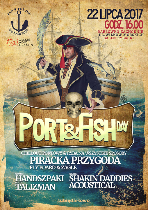 Zarząd Portu Morskiego w Darłowie zaprasza serdecznie 22 lipca do udziału w super, pirackiej zabawie w ramach imprezy pn.: Port & Fish Day. Odbędzie się ona w Darłówku Zachodnim, na końcu ulicy Wilków Morskich - na terenie nowego basenu rybackiego. Nie zabraknie iście pirackich atrakcji, rybactwa, wędkarstwa, żeglarstwa, flyboardu i chilloutu portowego. A do tego nasz regionalny przysmak - czyli bałtyckie ryby na wiele sposobów. Szantowo zagrają Handszpaki, coverowo - Shakin Daddies i Acoustical a na koniec pokręcimy się w rytmach Disco Talizman.