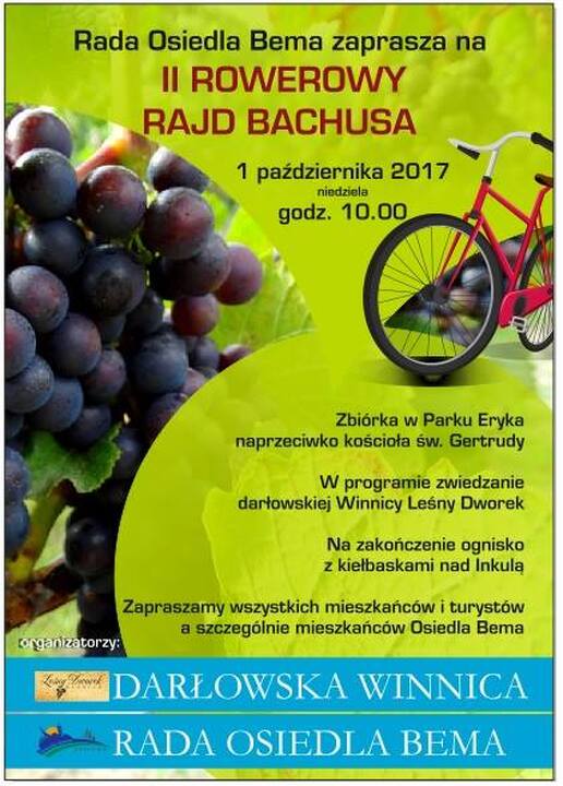 Rada Osiedla Bema zaprasza do udziału w sportowej niedzieli i wzięcia udziału w II Rowerowym Rajdzie Bachusa. Zbiórka 1 października, o godz. 10:00 w Parku Króla Eryka - tj. vis a vis Kościoła Św. Gertrudy - ul. O.D. Tynieckiego. W programie m.in.: zwiedzanie darłowskiej Winnicy Leśny Dworek a na zakończenie ognisko z kiełbaskami nad Inkulą. Zatem: dobre nastawienie, czapka na głowę, rękawice na zapasie i spotykamy się 1 października.
