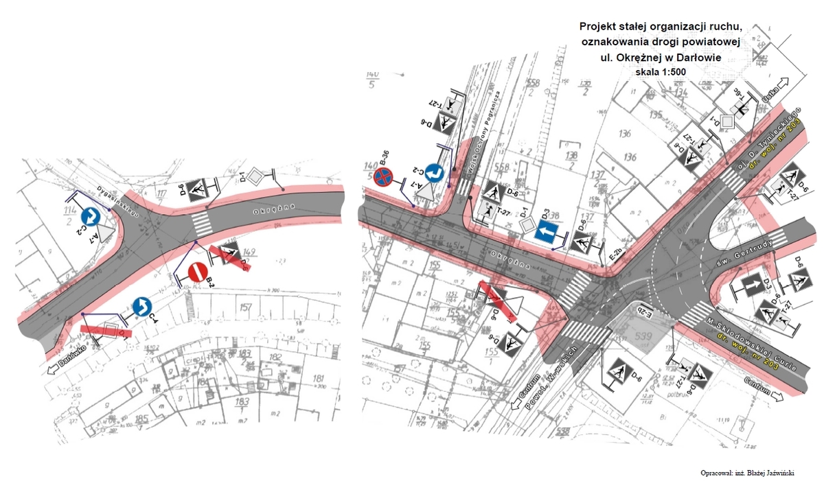 - na ulicy Okrężnej – od skrzyżowania z ul. O. D. Tynieckiego do skrzyżowania z ul. A. Dygasińskiego, ustawiony zostanie znak D-3 droga jednokierunkowa. Po stronie prawej - od skrzyżowania z ul. O. D. Tynieckiego do skrzyżowania z ul. A. Dygasińskiego, ustawiony zostanie znak B-36 – zakaz zatrzymywania się,