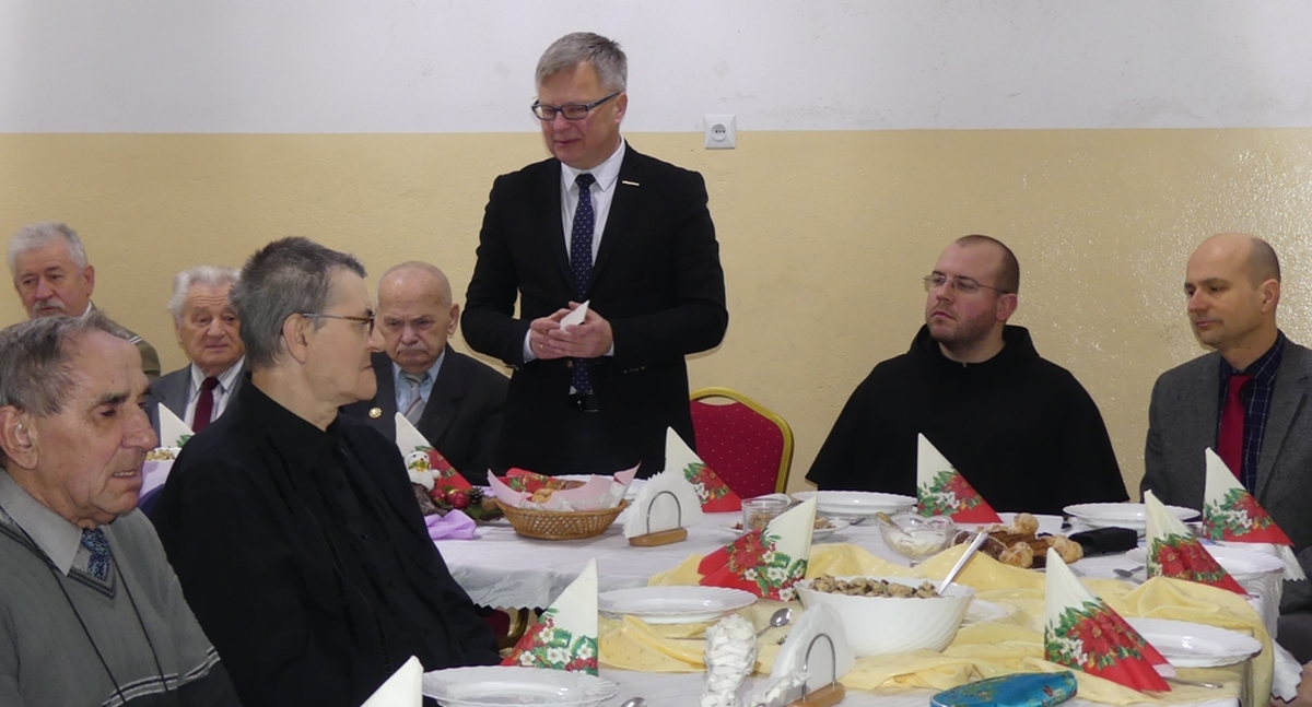 Oprócz licznie przybyłych członków i sympatyków tych związków i organizacji swoją obecnością zaszczycili opłatek: Arkadiusz Klimowicz-burmistrz Darłowa, Radosław Głażewski -wójt gminy Darłowo, franciszkanin -o Karol Wesołowski, Kazimierz Kuligowski - prezes ZKRP i BWP oraz szef PKPS, przewodniczący Polskiego Związku Niewidomych – Włodzimierz Balcerzak, który poprowadził całą uroczystość. Głos zabrali: burmistrz, wójt i franciszkanin. Życzyli oni wszystkim przybyłym i ich rodzinom zdrowia, szczęścia, dużo radości i pomyślności w Nowym Roku 2018. Stół wigilijny udekorowany gałązkami świerku i zapalonymi świecami uginał się od postnych potraw. Były tam śledzie marynowane dwojakiego rodzaju, pierogi z kapustą, kluski z makiem i rodzynkami, kapusta z grochem, czerwony barszczyk,chleb, ziemniaki a także pyszne ciasta, kawa i herbata. Śpiewano kolędy, przy akompaniamencie Jana Schwarzlose i jego akordeonu, łamano się opłatkiem i składano życzenia. Pani Maria Tyzo -Kwiecińska z PZN napisała i odczytała specjalnie napisany na tę okoliczność wiersz: