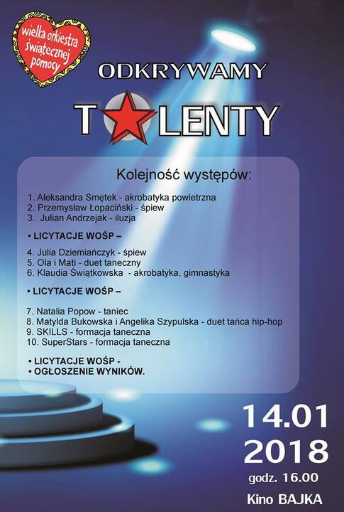 Główna impreza, związana z licytacjami gadżetów na WOŚP, odbędzie się 14 stycznia, w kinie Bajka i będzie połączona z finałem X edycji konkursu "Odkrywamy Talenty". Start o godz. 16.