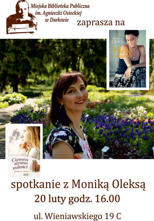 Miejska Biblioteka Publiczna im. A. Osieckiej w Darłowie z siedzibą przy ul. Wieniawskiego 19 C zaprasza w dniu 20 lutego br. (tj. wtorek) na spotkanie z Moniką Oleksą. Spotkanie rozpocznie się o godzinie 16:00. Wstęp wolny. Więcej o autorce na: http://lubimyczytac.pl/autor/47542/monika-a-oleksa