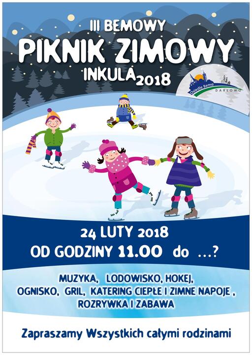 Rada Osiedla Bema zaprasza wszystkich mieszkańców na otwarty III Bemowy Piknik Zimowy - INKULA 2018. Odbędzie się on w sobotę, 24 lutego br. w godzinach 11:00 -17:00. W tym roku zabawa nad INKULĄ odbędzie się pod hasłem „W POSZUKIWANIU ZIMY" a w programie: ognisko, muzyka, zabawy zręcznościowe i jeżeli pogoda pozwoli to i harce na lodzie oraz iście piknikowy catering czyli; kiełbaski, karkówka itd. Proszę zabrać ze sobą znajomych, przyjaciół i dobry humor.