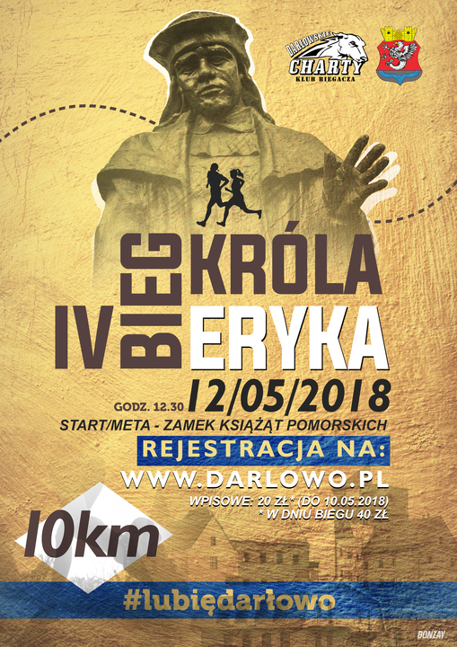 Już po raz czwarty Miasto Darłowo zaprasza do udziału w Biegu Króla Eryka - króla z Darłowa. Bieg na dystansie 10 km wiódł będzie ulicami miasta oraz jego nadmorskiej, plażowej dzielnicy - Darłówka. Start i meta biegu znajdować się będzie na Zamku Książąt Pomorskich - Muzeum w Darłowie (ul. Zamkowa 4). Ta biegowa impreza odbędzie się w sobotę - 12 maja 2018 roku i będzie przedbiegiem do Dni Darłowa czyli 706 urodzin Miasta Króla Eryka.