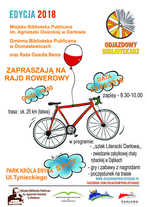 Miejska Biblioteka Publiczna im. Agnieszki Osieckiej w Darłowie, Gminna Biblioteka Publiczna w Domasławicach oraz Rada Osiedla Bema w Darłowie zapraszają wszystkich chętnych do udziału w rajdzie rowerowym pn.: Objazdowy Bibliotekarz. Rajd obędzie się w sobotę, 23 czerwca 2018 roku na dystansie 25 km (trasa łatwa). Zapisy chętnych w dniu i miejscu imprezy tj. Darłowo - ul. Tynieckiego (Park Króla Eryka), od godziny (;30 do 10:00. W programie: Szlak Literacki Darłowa, zwiedzanie zabytkowej chaty rybackiej w Dąbkach, gry i zabawy z nagrodami, poczęstunek na trasie. Dobre nastawienie mile widziane. Do zobaczenia w sobotę na rajdzie Objazdowy Bibliotekarz. Liczymy na Wasza obecność.