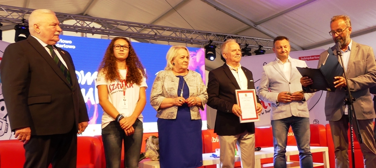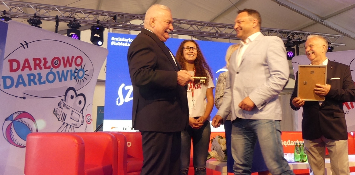 Tytuł ten został nadany założycielowi i pierwszemu przewodniczącemu Niezależnego Samorządnego Związku Zawodowego „Solidarność” przez Radę Miejską już w roku 2010- w trzydziestą rocznicę sierpnia 80. Przywódca Solidarności, jeden z symboli obalenia komunizmu w Europie środkowo-wschodniej, laureat nagrody Nobla 29 września bieżącego roku skończy 75 lat życia. Były prezydent RP, obok papieża Jana Pawła II, jest najbardziej znanym Polakiem we współczesnym świecie. W imieniu Arkadiusza Klimowicza burmistrza Darłowa, który przebywa poza granicami naszego kraju klucze do Królewskiego Miasta Darłowa i Honorowy Dyplom wręczyli: starosta sławieński Wojciech Wiśniowski, wiceburmistrz Elżbieta Karlińska i wiceprzewodniczący Rady Miejskiej Czesław Woźniak. Z okazji tej miłej uroczystości odczytano list gratulacyjny i okolicznościową laudację od Arkadiusza Klimowicza burmistrza Darłowa o następującej treści