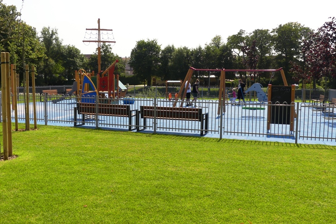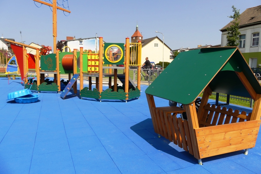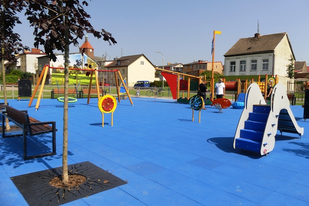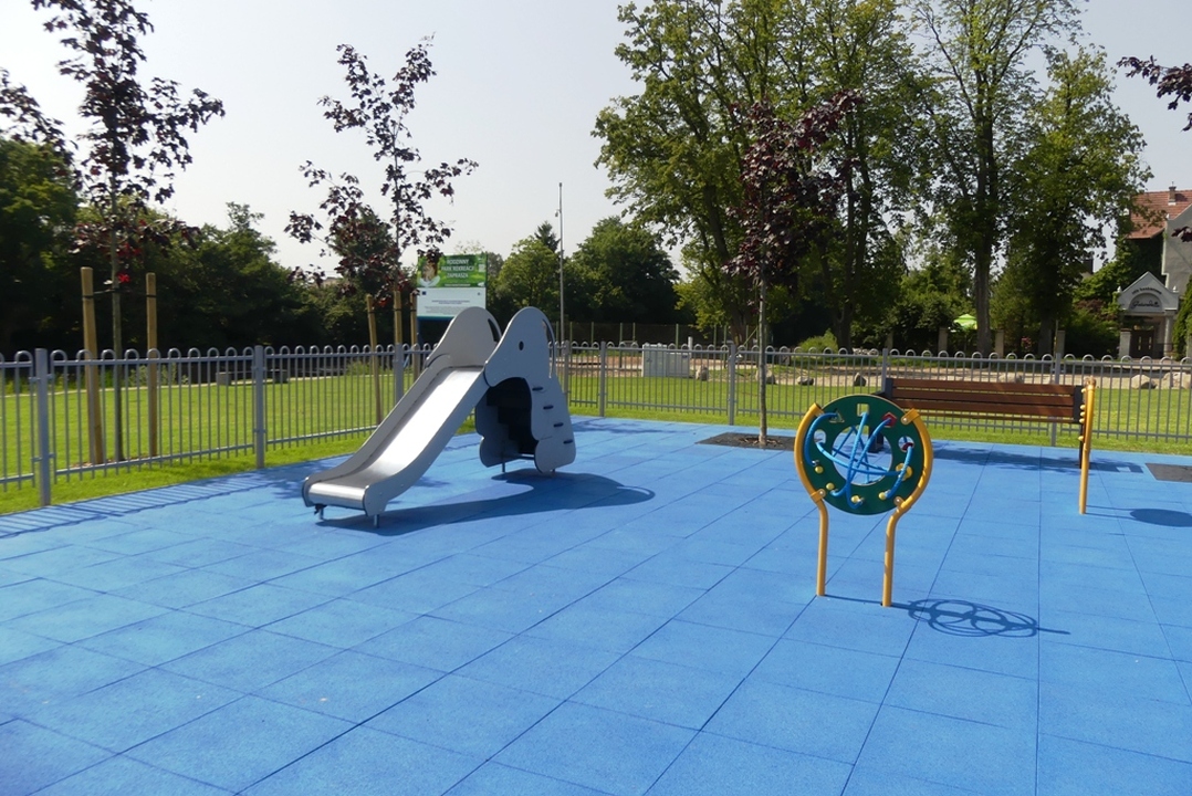 Na ogrodzonym placu zabaw wyłożonym bezpieczną nawierzchnią zamontowano urządzenia do gier i zabaw takie jak: statek, podwójna huśtawka, przeplatanka figury, koło labirynt, tablica do rysowania, rybka na sprężynie, deska windsurfingowa na sprężynie, domek dla maluchów, sklepik z tablicą, zjeżdżalnia słoń. Przy ścieżce spacerowej na terenie zielonym zamontowano dwa stoliki do gry w szachy z ośmioma krzesłami, 3 sztuki koszy na odpadki i 3 szt koszy na psie odchody, stojak rowerowy i dwie piaskownice typu muszelka. Osobne miejsce urządzono na ognisko otoczone przez 14 siedzisk. Ponadto na terenie rekreacyjnym zamontowano 11 ławek, zasadzono17 drzew, 56 krzewów iglastych i 38 krzewów liściastych.