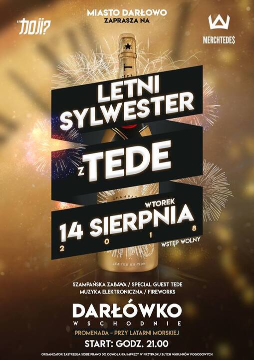 W trakcie imprezy nie zabraknie dobrej muzyki do sylwestrowego tupnięcia nóżką, a na finał oczywiście symbolicznie powitamy Nowy Rok wystrzałowo. Strzelać też będą korki od szampanów. Dlatego też zaprosiliśmy specjalistę od tych bąbelkowych napoi. NOJI wiecie już o Kogo chodzi ? Tak ! Gościem specjalnym będzie lubiący Darłowo TEDE. Razem z Ekipą NWJ spędzą z nami ten czas, a może i uda się namówić rapera na kilka utworów, w których teledyskach bardzo często leje się strumieniami szampan.