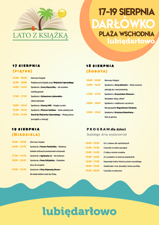 Lato z książką to niewątpliwie jeden z ciekawszy eventów literackich organizowanych w kraju. W letniej, plażowej scenerii, do tego rozmowy o rzeczach ambitnych ale podane w luźnej, wakacyjnej formie.  To wszystko już w dniach 17-19 sierpnia 2018 roku na plaży wschodniej w Darłówku (ul. Kąpielowa). A jaką dawkę dobrych spotkań otrzymają Mieszkańcy i turyści Darłowa?