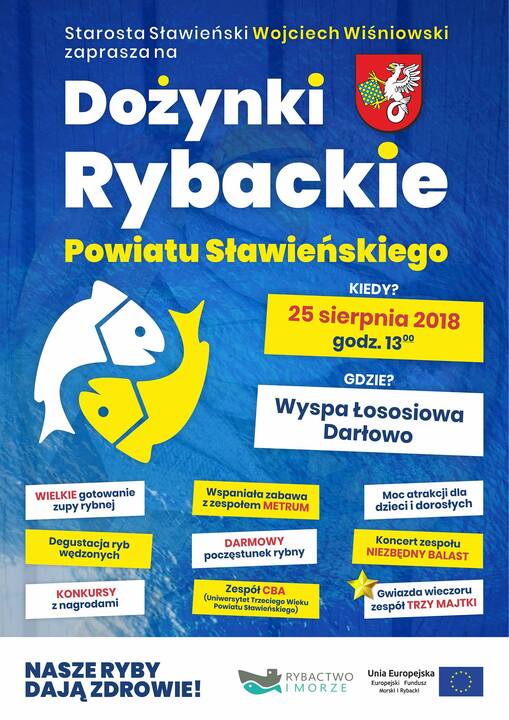 Starosta Sławieński - Wojciech Wiśniowski zaprasza na Dożynki Rybackie Powiatu Sławieńskiego, które odbędą się w Darłowie (Wyspa Łososiowa) 25 sierpnia 2018. Początek imprezy o godz. 13:00. W programie m.in.: