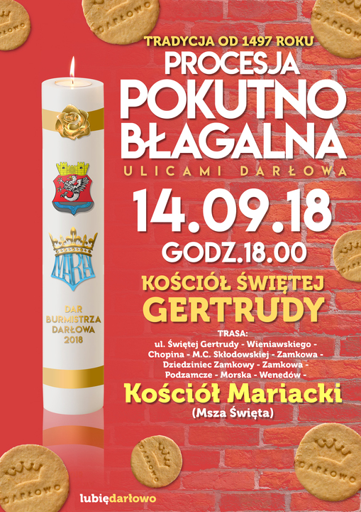 W tym roku procesja pokutno - błagalna odbędzie się 14 września. Rozpoczniemy ją Nieszporami o godzinie 18:00 w Kościele Św. Gertrudy. Następnie przedstawiciele wszystkich darłowskich parafii wraz z burmistrzem, radą miejską i mieszkańcami miasta przejdą ulicami Darłowa by dotrzeć do Kościoła Mariackiego.