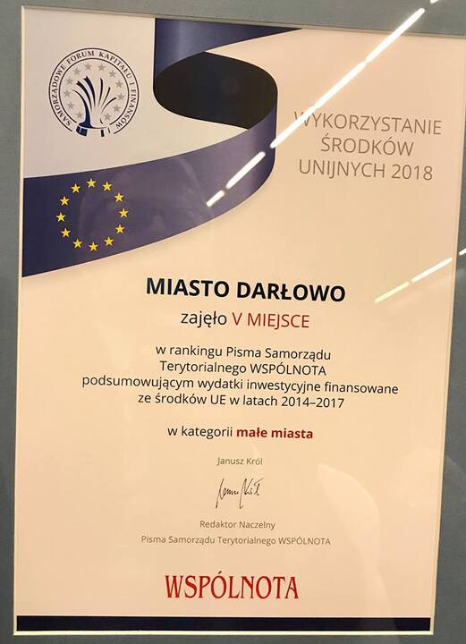 Na XVI Samorządowym Forum Kapitału i Finansów w Katowicach, jakie odbyło się w dniach 3 i 4 października 2018 Arkadiusz Klimowicz burmistrz miasta Darłowa odebrał dyplom i gratulacje za zdobycie V miejsca w rankingu Pisma Samorządu Terytorialnego WSPÓLNOTA podsumowującym wydatki inwestycyjne finansowane ze środków Unii Europejskiej w latach 2014-2017 w kategorii Małe Miasta.
