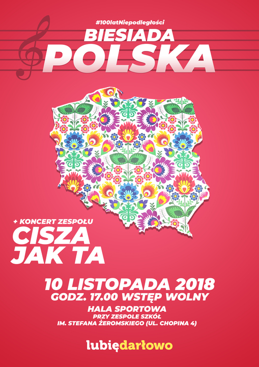 Wieczornica. Biesiada Polska, czyli wydarzenie muzyczno - kulturalne, na fundamencie patriotycznym organizowane jest w Darłowie z inicjatywy Burmistrza Arkadiusza Klimowicza od 4 lat. Wieczór Polaków spędzany przy wspólnym stole w trakcie obchodów Narodowego Święta Niepodległości przypadł do gustu mieszkańcom Darłowa, którzy po części sami wydarzenie to tworzą. Część artystyczna bowiem składa się z programu artystycznego, w który angażują się placówki edukacyjne działające w mieście, stowarzyszenia i organizacje a także wszyscy, którzy mają ochotę zaprezentować się przed publicznością. Tematem przewodnim jest historia Polski, związana z odzyskaniem jej niepodległości. W tym roku zapraszamy na Biesiadę Polską w dniu 10 listopada 2018 roku (tj. sobota), godz. 17:00 - do hali gimnastycznej przy Zespole Szkół im. Stefana Żeromskiego w Darłowie (ul. Chopina 4). W programie m.in. koncert Cisza jak Ta.