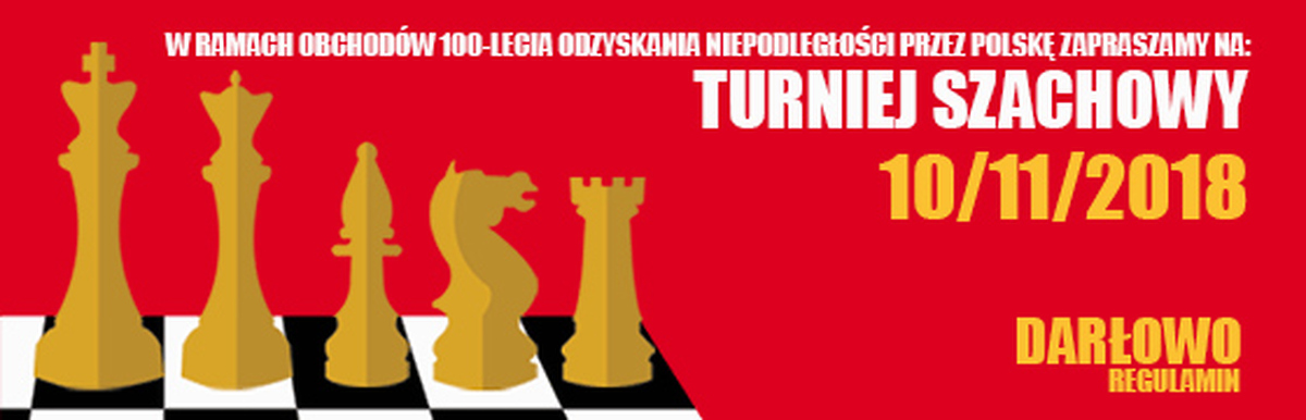 Miasto Darłowo oraz Miejski Klub Sportowy Darłovia Darłowo  w ramach obchodów 100-lecia Odzyskania Niepodległości przez Polskę zaprasza na Turniej Szachowy.