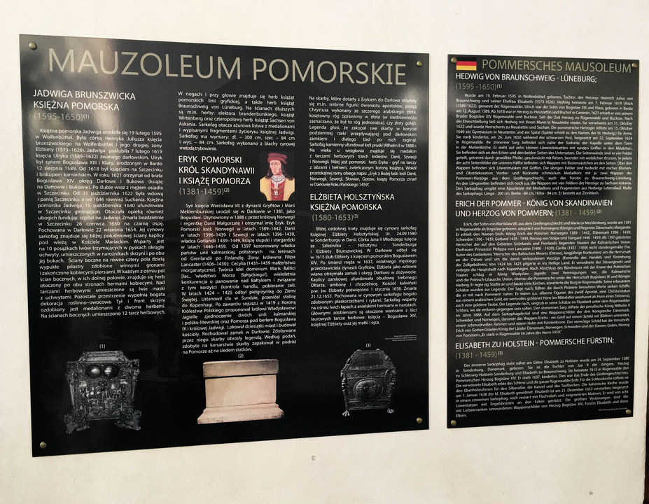 Jakiś czas temu informowaliśmy, że z inicjatywy Burmistrza Darłowa zamontowano w Kościele Mariackim nową tablicę informacyjną przy Mauzoleum Pomorskim. Tablica w języku polskim zawiera opis biograficzny oraz notki charakteryzujące królewskie i książęce sarkofagi. Opracowaniem merytorycznym zajał się Leszek Walkiewicz, a tablice zaprojektował Daniel Frącz. Teraz też ucieszą się turyści posługujący się językiem niemieckim. Dzięki realizacji tłumaczenia przez Panią Brygidę Jerzewską udało się również poszerzyć tablice właśnie o opis w tym języku. Zapraszamy do odwiedzin krypty.