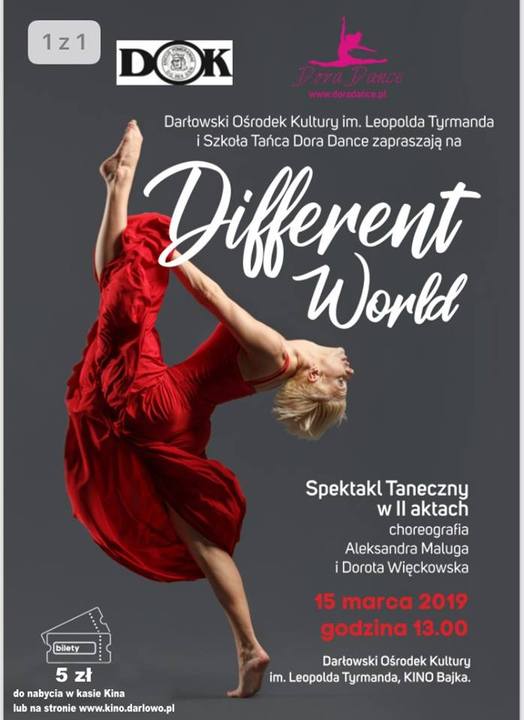 Darłowski Ośrodek Kultury im. Leopolda Tyrmanda i Szkoła Tańca Dora Dance zapraszają na: „Different World". Spektakl Taneczny w II aktach. Choreografia: Aleksandra Maluga i Dorota Więckowska. 15 marca 2019, godz. 13:00. Bilety w cenie 5 PLN do nabycia w kasie kina Bajka (Darłowo, ul. Morska 56).