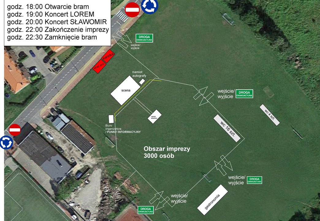 Już w sobotę zapraszamy na koncert zespołu SŁAWOMIR oraz LOREM. Dla lepszej komunikacji wrzucamy graficzny plan tego wydarzenia. 18.05.2019, Darłowo, ul. Sportowa, otwarcie bram o godz. 18:00. Każdy uczestnik otrzyma przy wejściu bezpłatną bilet wstępu, który należy zwrócić ochronie przy wyjściu. Na ogrodzonym terenie może przebywać ograniczona liczbą osób. Przed wejściem należy zapoznać się z regulaminem imprezy wywieszonym przy każdym z wejść na teren.