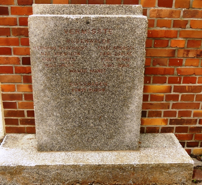Płyta pochodzi z pomnika wystawionego poległym mieszkańcom Darłowa podczas I wojny światowej.  Pomnik upamiętniający żołnierzy poległych w czasie I wojny światowej odsłonięto uroczyście 4 czerwca 1922 r. na wzgórzu Kopa. Wyko­nano go z granitowych bloków w kształcie tumby spoczywającej na wyso­kim cokole, na którym w pięciu kolumnach umieszczono  nazwiska po­ległych mieszkańców miasta. Na tumbie znajdował się odlany z brązu relief,  przedstawiający młodą niewiastę, przyjmującą z rąk anioła napełnioną czarę. Scena ta była symbolem przerwanego młodego życia ziemskiego i do­stąpieniem niebiańskiej szczęśliwości. Po II wojnie światowej pomnik rozebrano, bloki kamienne ustawiono na skraj parku, a płyta z brązu zaginęła. Znaleziony granitowy blok jest jednym z pięciu, na których wyryto nazwiska poległych mieszkańców Darłowa.  Po odnowieniu zamontowano go na dziedzińcu zamkowym  przy wejściu na wystawę Dirlov- Rügenwalde- Darłowo.