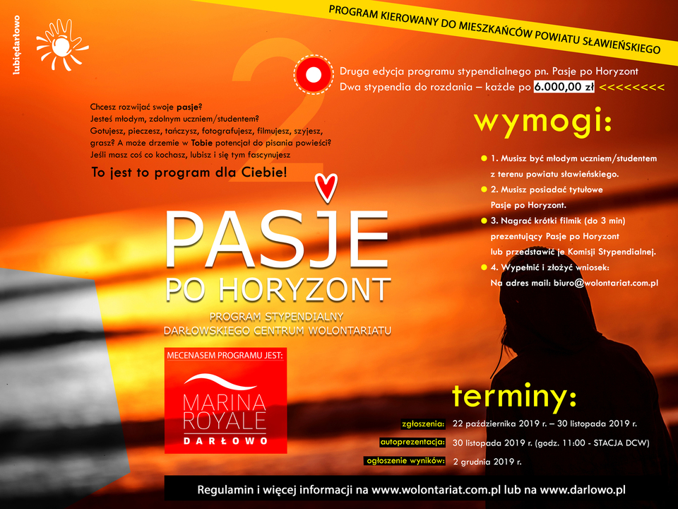 Jeśli jesteś pełnoletnim uczniem lub studentem z powiatu sławieńskiego, masz jakieś zamiłowania i pasje i chciałbyś je rozwijać - to jest to projekt dla Ciebie. Pasje po Horyzont to program stypendialny Darłowskiego Centrum Wolontariatu, który zakłada przyznanie dwóch stypendiów finansowych - każde po 6000 zł. Mecenasem tego programu jest belgijska spółka POC Partners, która w Darłowie wybudowała luksusowy apartamentowiec pod nazwą Maryna Royale Darłowo i jest partnerem strategicznym Darłowskiego Centrum Wolontariatu.