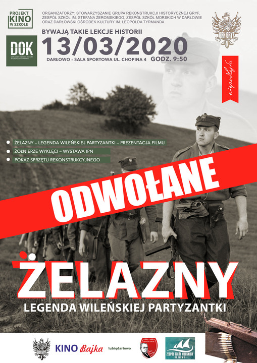 W związku z komunikatem Wojewody Zachodniopomorskiego z dnia 10 marca 2020 roku, w trosce o młodzież, która była grupą docelową tego wydarzenia i po konsultacji z dyrekcją zarówno Zespołu Szkół Morskich w Darłowie jak i gospodarzem miejsca wydarzenia (Dyrektorem Zespołu Szkół im. Stefana Żeromskiego w Darłowie) – odwołuję pokaz filmu.