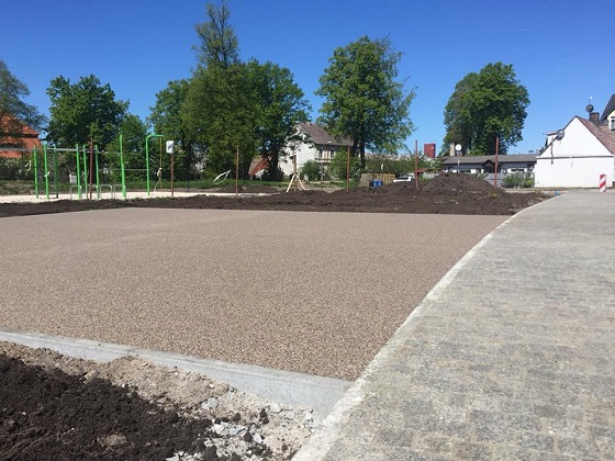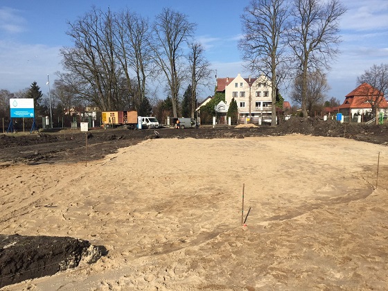 Firma Ogrody s.c ze Słupska, podwykonawca firmy Krężel (główny wykonawca) przystąpiła do przygotowania terenu pod trawę z rolki.